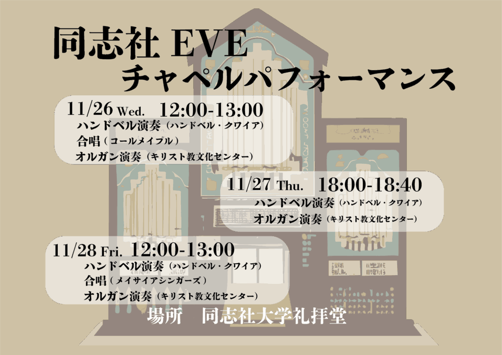 国の重要文化財である同志社礼拝堂。その歴史ある空間では、合唱・ハンドベル・オルガンなど多彩な演奏が響き合い、礼拝堂ならではの厳かで心に残るひとときをお届けします。格調高い雰囲気と豊かな音色が織りなす特別な時間を、ぜひご体感ください。