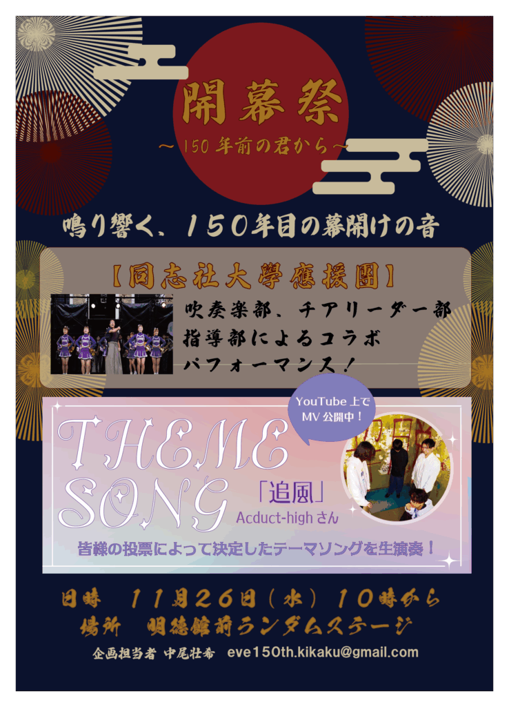 皆さんの投票によって選ばれた今年のテーマソング、Acduct-Highさんの「追風」を開幕祭のステージで生演奏!!MVは同志社EVEの公式YouTubeで11月17日に公開予定です!