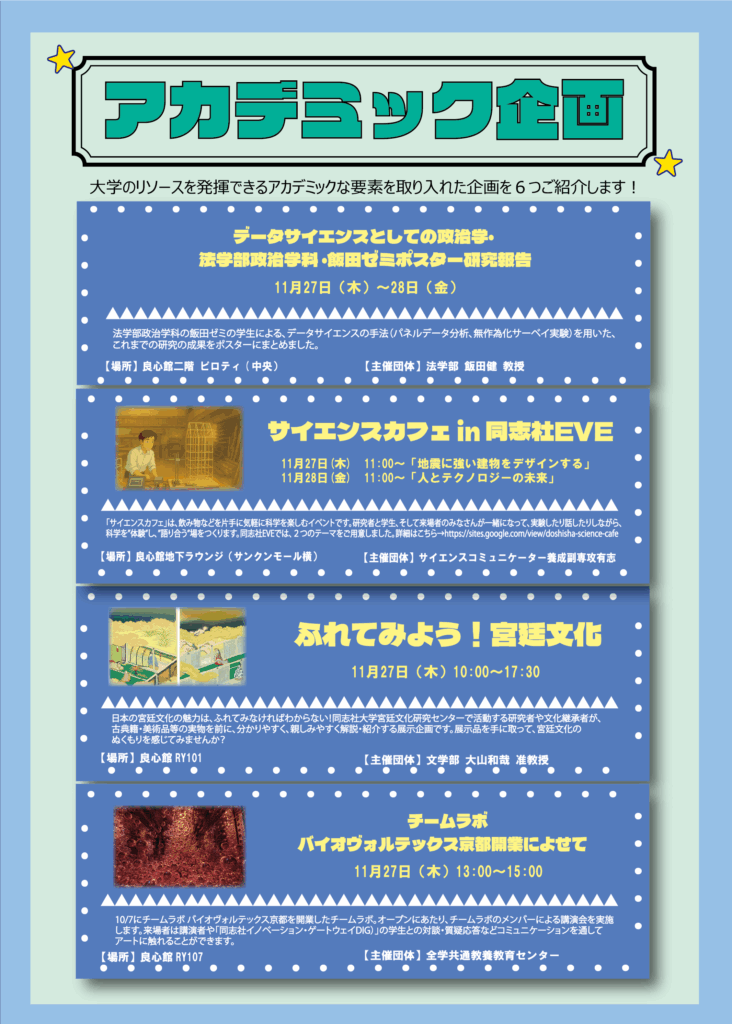第150回同志社EVEでは、「学生生活の発露の場」としての魅力に加え、「幅広い年齢層の一般来場者の皆さまにも楽しんでいただける企画」という2つの軸を大切にしながら、バラエティ豊かな目玉企画を多数ご用意しています。学生の情熱があふれるステージから、ご家族連れでも気軽に参加できる体験型イベントまで、多彩なコンテンツが盛りだくさんです。より多くの皆さまに、今年の同志社EVEを心から満喫していただければ幸いです。